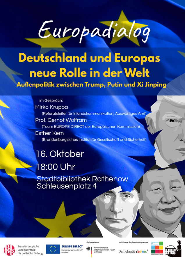 Die politische Welt ist im Wandel. Die Außenpolitik zwischen Trump, Putin und Xi Jinping stellt für Deutschland und Europa eine große Herausforderung dar und es brechen immer neue Frage auf: Wie geht europäische Sicherheitspolitik nach dem möglichen Bruch alter transatlantischer Bündnisse? Wie geht mehr gemeinsames Europa in Zeiten nationalistischer Absetzbewegungen? Wie kann eine gemeinsame europäische Außen- und Sicherheitspolitik aussehen? Erleben wir die Rückkehr zu Abschreckung und einem (neuen) kalten Krieg? Im Europadialog am Donnerstag, den 16.10.2025, wird es um diese Fragen gehen. Im Gespräch mit Esther Kern vom Brandenburgischen Institut für Gesellschaft und Sicherheit erläutern Mirko Kruppa, Referatsleiter Inlandskommunikation im Auswärtigen Amt sowie Prof. Gernot Wolfram vom Brandenburgischen Institut für Gesellschaft und Sicherheit über die aktuellen Entwicklungen.