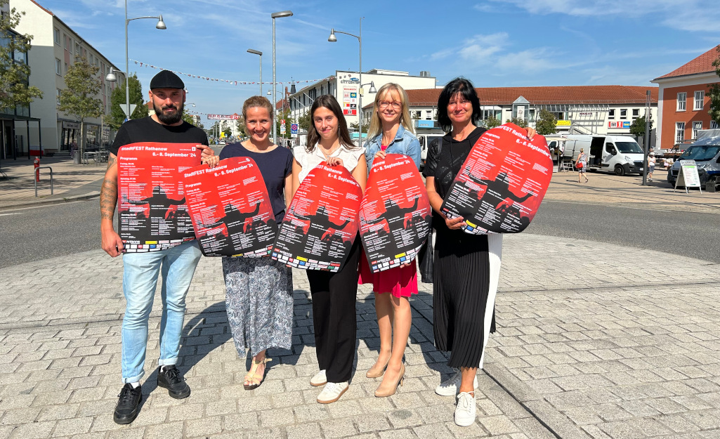V. l.: Akteure des Stadtfestes: Streetworker Rick Smyczek, Katrin Rentmeister, Sachgebietsleiterin für Kultur, Jugend und Sport der Stadt Rathenow, Ella Pidde und Anja Dorenburg von der dorenburg | event & catering GmbH und Petra Sandbrink von Mode Sandbrink, Foto: Anne Kießling, Stadt Rathenow