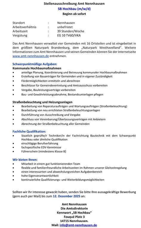 Stellenausschreibung: Sachbearbeitung Hochbau (m/w/d) beim Amt Nennhausen