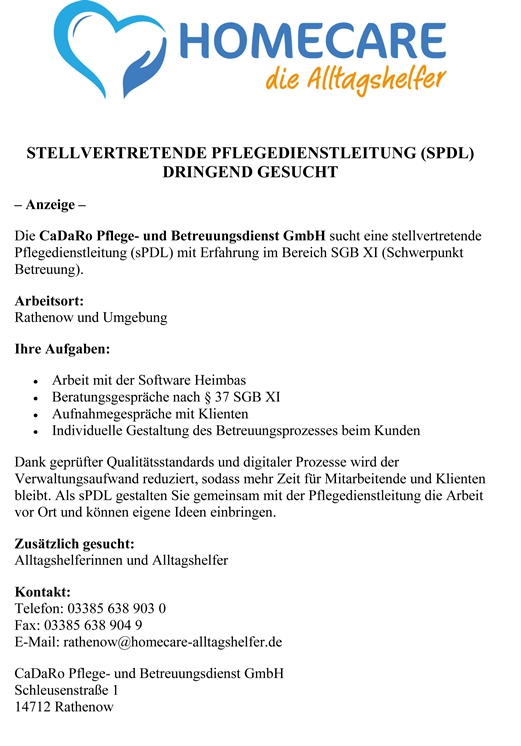 Die CaDaRo Pflege- und Betreuungsdienst GmbH sucht eine stellvertretende Pflegedienstleitung (sPDL) mit Erfahrung im Bereich SGB XI (Schwerpunkt Betreuung).