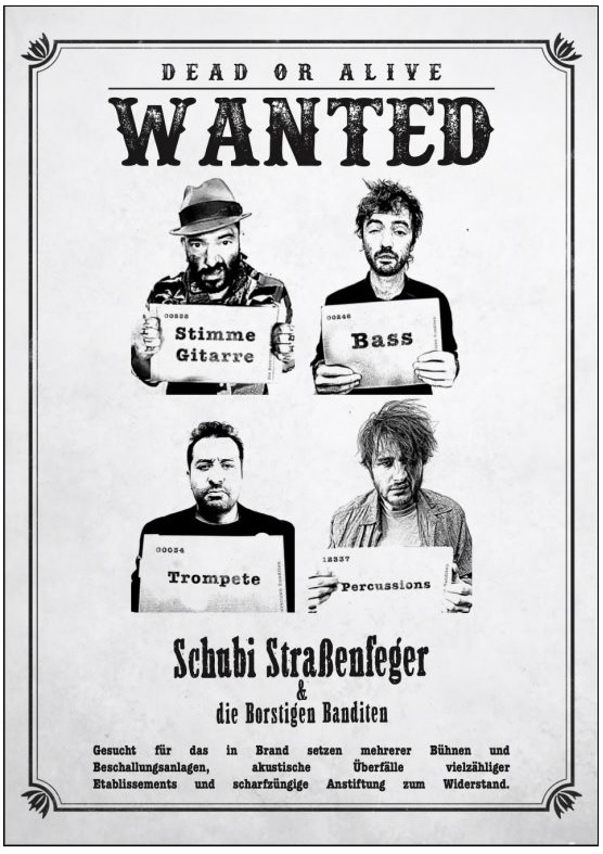 Mit rauem Gesang, scheppernden Gitarren, Trompeten, Kontrabass und viel Rhythmus ziehen Schubi Straßenfeger & die Borstigen Banditen durch die Klangprärie. Das akustische Gaunerkollektiv verbindet Wortwitz, Tiefgang und Banditenfolk zu einem energiegeladenen Auftritt.