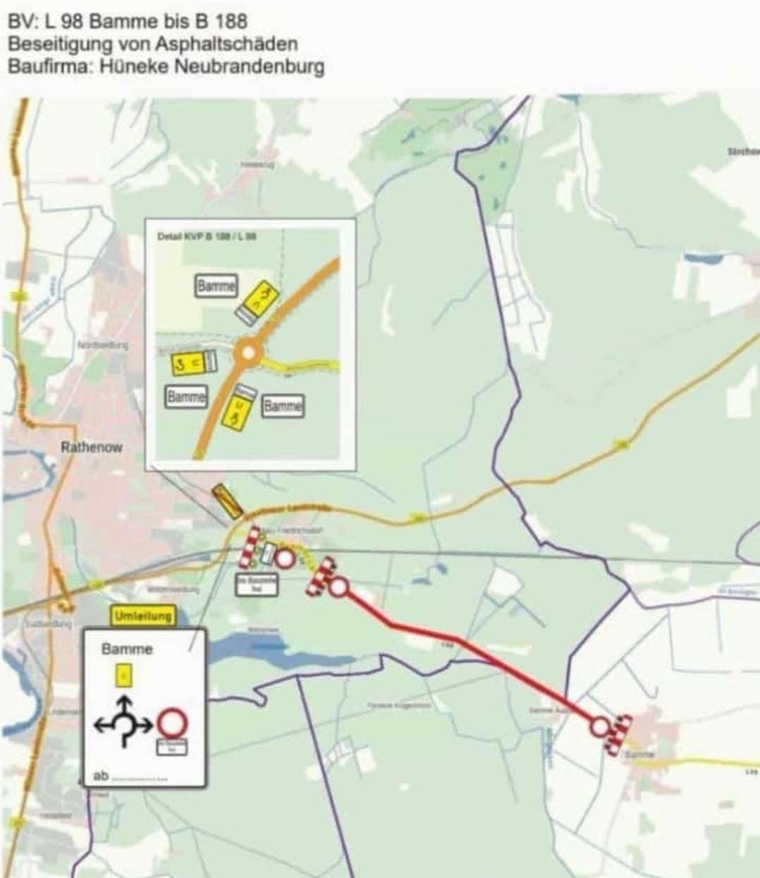 Im Zeitraum vom 18. Juli bis zum 3. August 2024 wird die Landesstraße 98 (L98) zwischen Rathenow und Bamme vollständig gesperrt. Diese Sperrung ist notwendig, um Schadstellen auf der Fahrbahn zu beseitigen und die Verkehrssicherheit zu gewährleisten.