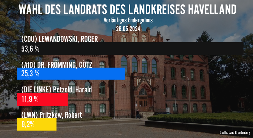 Bei der Landratswahl im Landkreis Havelland konnte Roger Lewandowski von der CDU mit 53,6 % der Stimmen einen klaren Sieg erringen. Auf den zweiten Platz kam Dr. Götz Frömming von der AfD mit 25,3 %, gefolgt von Harald Petzold von DIE LINKE mit 11,9 % und Robert Pritzkow von der LWN mit 9,2 %.