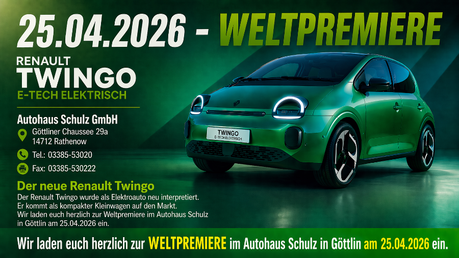 Am Samstag, 25. April 2026, wird es im Autohaus Schulz in Göttlin besonders spannend: Dort wird der neue Renault Twingo E-Tech elektrisch im Rahmen einer Weltpremiere vorgestellt. Wer den neuen Kleinwagen aus nächster Nähe erleben möchte, hat an diesem Tag die Gelegenheit dazu.